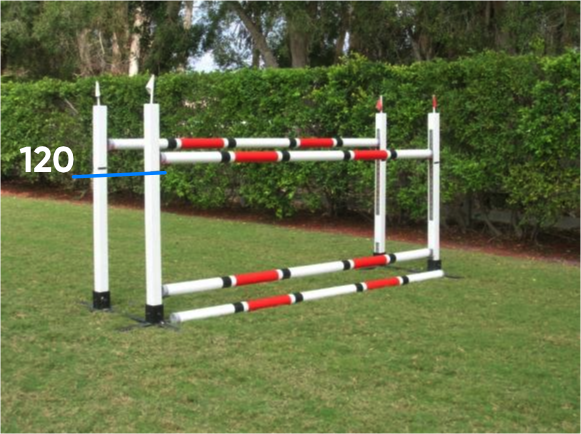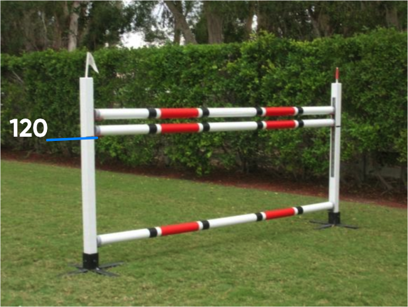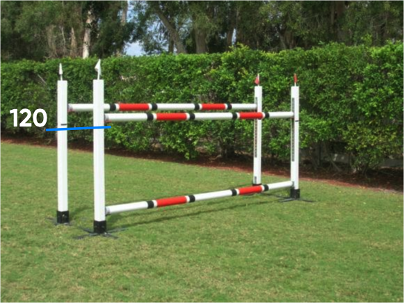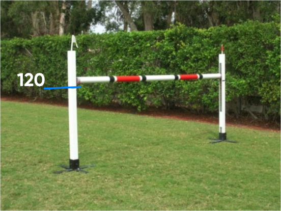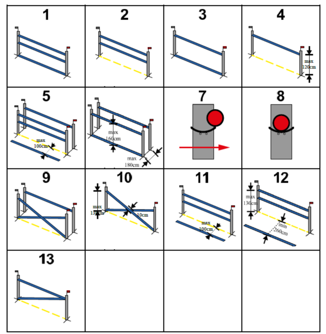 Höhe = max. 10 cm höher als die Höhe der entsprechenden Prüfung (ausgenommen Zeichnung 4), aber nie höher als 160 cm. Bei Kreuzen und schrägen Stangen ist die Höhe der Auflagen massgebend. Bei Oxern darf die hintere Stange nie tiefer als die vordere sein. Taktstangen (Zeichnungen 11 und 12) sind nur erlaubt, wenn keine anderen Reiter:innen an diesem Hindernis springen.