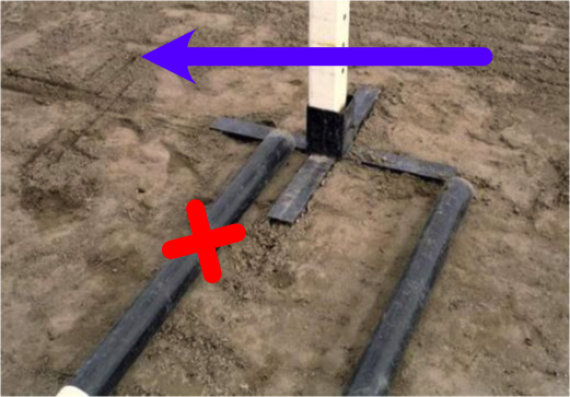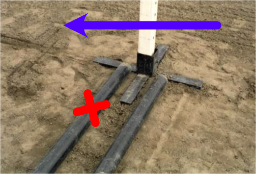 Bei einem Oxer darf die vordere Stange auf dem hinteren Rand der Auflage abgelegt werden. Sie kann auch auf den Rand des Löffels gelegt werden, der an der Halterung des Hindernisses befestigt ist (siehe beide Beispiele oben). Die hinteren Stangen dürfen nur auf den hinteren Rand der Auflage verlegt werden (siehe Beispiele unten).