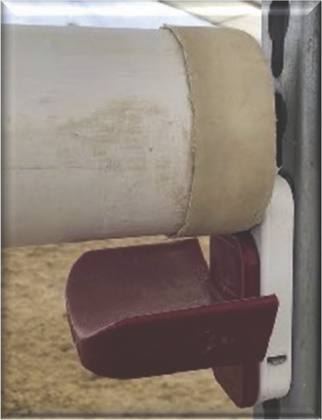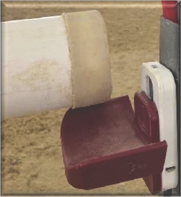 Die Stange eines Steilhindernisses kann auf dem hinteren Rand der Auflage abgelegt werden. Sie kann auch auf den Rand des Löffels gelegt werden, der an der Halterung des Hindernisses befestigt ist.